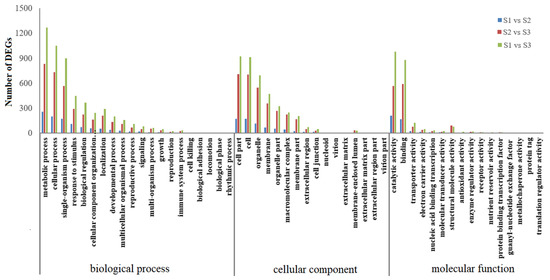 To further explore the function of these DEGs, Gene Ontology (GO) enrichment analysis was carried out. As a result, 395 (S1 vs. S2), 1244 (S2 vs. S3), and 1878 (S1 vs. S3) DEGs were divided into biological process, cellular component, and molecular function categories (Figure 3 and Table S2). As shown in Figure 3, the biological process category contained 20 functional groups, in which ‘metabolic process’, ‘cellular process’, and ‘single-organism process’ were the top three represented terms. In the cellular component category, 16 functional groups were enriched, and the most abundant terms were ‘cell part’, ‘cell’, and ‘organelle’. For the molecular function category, 16 functional groups were identified, and the terms with greatest abundance were ‘catalytic activity’, ‘binding’, and ‘transporter activity’.