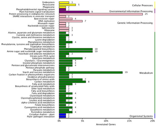 To investigate the metabolic pathways involved by the DEGs, Kyoto Encyclopedia of Genes and Genomes (KEGG) analysis was performed. A total of 237 (S1 vs. S2), 789 (S2 vs. S3), and 1244 (S1 vs. S3) DEGs were assigned to 69, 99, and 113 KEGG pathways, respectively (Table S3). All of the pathways from these three comparison groups could be further divided into five categories: Cellular processing, environmental information processing, genetic information processing, and metabolism and organismal systems (Figure 4 and Figures S1 and S2). Among the five groups, the metabolism group had the richest number of pathways. Furthermore, in the S1 vs. S2 comparison, the protein processing in endoplasmic reticulum (ko04141, 25genes), starch and sucrose metabolism (ko00500, 19 genes), amino sugar and nucleotide sugar metabolism (ko00520, 10 genes), and phenylpropanoid biosynthesis (ko00940, 10 genes) were the most abundant pathways (Figure 3). In S2 vs. S3, DEGs were most highly enriched in the ribosome (ko03010, 80 genes), protein processing in endoplasmic reticulum (ko04141, 62 genes), spliceosome (ko03040, 37 genes), and starch and sucrose metabolism (ko00500, 31genes) (Figure S1). The top four DEGs from S1 vs. S3 were mapped to the ribosome (ko03010, 60 genes), starch and sucrose metabolism (ko00500, 57 genes), protein processing in endoplasmic reticulum (ko04141, 53 genes), and carbon metabolism (ko01200, 43 genes) (Figure S2).