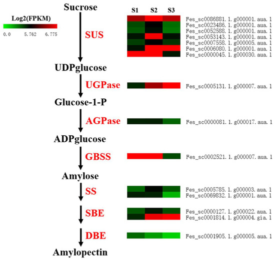 Expression patterns of starch biosynthesis genes that were differentially expressed during seed development. SUS: Sucrose synthase, UGPase: UDP glucose pyrophosphorylase, AGPase: ADP glucose pyrophosphorylase, GBSS: Granule bound starch synthase, SS: Starch synthase, SBE: Starch-branching enzyme (SBE), DBE: Debranching enzyme. S1, S2, and S3 stand for the seed samples at pre-filling stage, filling stage, and initial maturity stage, respectively.
