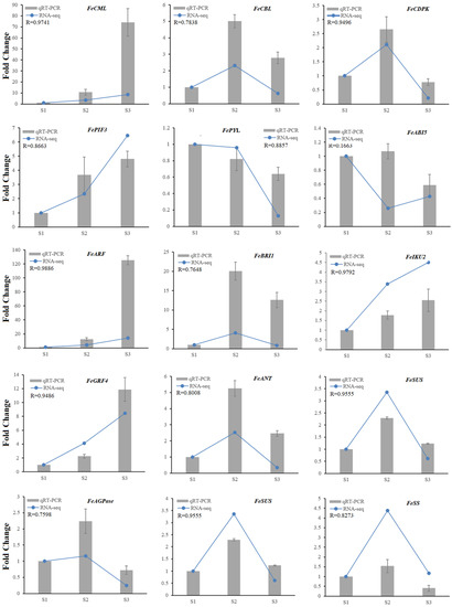 qRT-PCR analysis was performed to verify the RNA-Seq data. These genes that reflected some of the functional categories and different expression levels were selected. The reference cDNA sequences of these genes were obtained from the common buckwheat genome sequence database. The RT-qPCR primers were designed using Primer 5.0 software according to the reference cDNA sequences (Table S9). FeActin7 was used as the internal control. RT-qPCR was conducted using the SYBR premix Ex Taq kit (TaKaRa, Dalian, China) on ABI 7500 Fast Real-time PCR system (ThermoFisher Scientific, Waltham, MA, USA). Each sample was analyzed in triplicate. The relative expression change of each gene was calculated using the 2−ΔΔCt method [64]. The Pearson correlation coefficients between the fold change among different stages from qRT-PCR and from RNA-Seq were calculated using Origin 8.0.