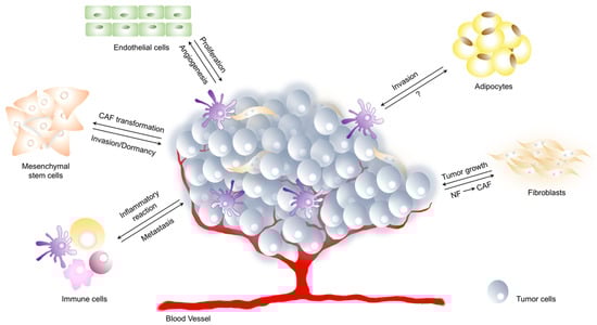 Then, cells of mesenchymal origin derive from the mesenchyme and include fibroblasts, myofibroblasts, mesenchymal stem cells, adipocytes and endothelial cells. Fibroblast, myofibroblast, and mesenchymal stem cells directly support cancer stem cells (CSCs) by creating a favourable niche and facilitating tumor progression, while endothelial cells constitute the walls of blood vessels and have a major role in vascular function and angiogenesis. So far, adipocytes were thought only as energy storage houses while recent studies have revealed the importance of factors secreted by adipocytes in tumor progression [].