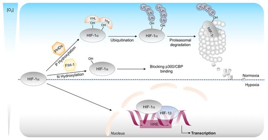 Thus, controlling both the degradation and inactivation of HIF-1α subunit, PHDs and FIHs ensure full repression of the HIF pathway under normoxia. On the other hand, when the oxygen level drops, the hydroxylases lose their activity and HIF-1α is stabilized and translocates into the nucleus where it dimerizes with HIF-1β subunit. HIF complex binds to DNA in the hypoxia-response elements (HRE) region and promotes genes transcription (Figure 2) [].