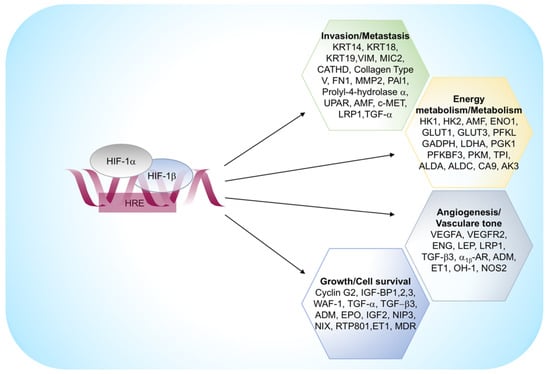 HIF-1α regulated genes. α1β -AR, α1β -adrenergic receptor; ADM, adrenomedullin; ALDA, aldolase A; AK3, adenylate kinase 3; ALDC, aldolase C; AMF, autocrine motility factor; CA 9, carbonic anhydrase 9; CATHD, cathepsin D; ENG, endoglin; ET1, endothelin-1; ENO1, enolase 1; EPO, erythropoietin; FN1, fibronectin 1; GLUT1, glucose transporter 1; GLUT3, glucose transporter 3; GAPDH, glyceraldehyde-3-P-dehydrogenase; HK1, hexokinase 1; HK2, hexokinase 2; IGF2, insulin-like growth-factor 2; IGF-BP1, IGF-factor-binding-protein 1; IGF-BP2, IGF-factor-binding-protein 2; IGF-BP3, IGF-factor-binding-protein 3; KRT14, keratin 14; KRT18, keratin 18; KRT19, keratin 19; LDHA, lactate dehydrogenase A; LEP, leptin; LRP1, Low density lipoprotein receptor-related protein 1; LDL-receptor-related protein 1; MDR1, multidrug resistance 1; MMP2, matrix metalloproteinase 2; NOS2, nitric oxide synthase 2; OH-1, heme oxygenase 1; PAI1, plasminogen-activator inhibitor 1; PFKBF3, 6-phosphofructo-2-kinase/fructose-2,6-biphosphatase-3; PFKL, phosphofructokinase L; PGK 1, phosphoglycerate kinase 1; PKM, pyruvate kinase M; TGF-α, transforming growth factor-α; TGF-β3, transforming growth factor-β3; TPI, triosephosphate isomerase; VEGFA, vascular endothelial growth factor A; UPAR, urokinase plasminogen activator receptor; VEGFR2, VEGF receptor-2; VIM, vimentin.