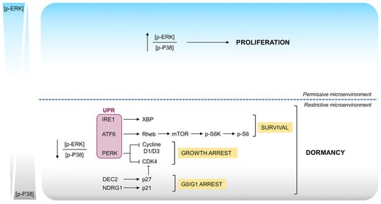 Moreover, phosphorylation of p38 leads to the activation of the unfolded protein response (UPR) pathway, which promotes cells survival and dormancy. Some studies from Aguirre-Ghiso laboratory highlight that, although all the three sensors of UPR, PERK, ATF6, IRE1 are activated in dormant human epidermoid carcinoma HEp3 cell, only PERK activation contributes towards the growth arrest of cells [,,,]. This occurs by attenuating translation of G1-S transition regulators such as cyclin D1, D3 and CDK4. On the other hand, the activation of both ATF6 and IRE1 are required for the basal adaptation and cell survival in restrictive microenvironment. This occurs in part via the ATF6 mediated Rheb induction and a strong inhibition of mTOR signaling (Figure 4) [].