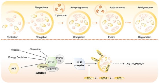 Depending on the mode of cargo delivery to the lysosome, autophagy can be subdivided into three subtypes: chaperon-mediated autophagy, microautophagy and the most studied process named macroautophagy []. Chaperone-mediated autophagy involves the direct translocation of cytosolic proteins across the lysosomal membrane, by molecular chaperones (e.g., the 70 kDa heat shock cognate protein, Hsp70). Microautophagy involves inward invagination of lysosomal membrane, which delivers a small portion of cytoplasm into the lysosomal lumen. Macroautophagy is the most efficient autophagic clearance mechanism and the most common type of autophagy, therefore, hereafter macroautophagy will be referred to as autophagy. Macroautophagy is a process conserved by yeast to mammals and is mediated by a double-membrane special organelle termed autophagosome. Upon induction, a small vesicle (phagophore) elongates and encloses a portion of cytoplasm, which results in the formation of the autophagosome. Then, the outer membrane of the autophagosome fuses with a lysosome to form an autolysosome, leading to the degradation of the enclosed materials together with the inner autophagosomal membrane. Aminoacids and other small molecules that are generated by autophagic degradation are delivered back to the cytoplasm for recycling or energy production []. Specifically, the process of autophagosome formation involves two major steps, nucleation and elongation of the isolation membrane, in which different proteins, such as the products of AuTophaGy-related (Atg) genes and microtubule-associated protein light chain 3 (LC3) are involved []. LC3 is one of the best characterized protein on autophagosome, and therefore, it serves as widely used marker of autophagy []. It is expressed in cells as a full-length cytosolic protein that, upon autophagy induction is proteolytically cleaved, to generate LC3-I that is conjugated with phosphatidylethanolamine and forms LC3-II (Figure 5) [,,].