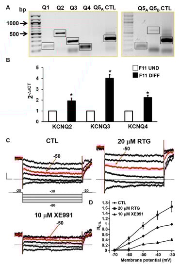 To investigate the possible role of Kv7 channels in TRPV1-activating pain-inducing stimuli, the expression of all KCNQ genes in undifferentiated F11 cells was first analyzed. As shown in the left panel of Figure 1A, semi-quantitative RT-PCR experiments revealed the presence of amplicons of the expected size for KCNQ2 (489 bp), KCNQ3 (238 bp), or KCNQ4 (98 bp) mRNAs, as previously reported in dorsal root ganglion neurons (DRG) [], whereas the amplicons for KCNQ1 (143 bp) and KCNQ5 (99 bp) were very faint or undetectable, respectively. Since KCNQ5 mRNA expression has been previously described in rat DRGs [], more stringent experimental conditions were used to reveal KCNQ5-specific transcripts; as a matter of fact, when 5 µg (instead of 1 µg) of total RNA in the retrotranscription reaction were used, a KCNQ5-specific band was clearly detected, as also confirmed by the results obtained with a second primer pair (amplicon expected size of 564 bp) directed toward a different region of KCNQ5 mRNA (right panel of Figure 1A). Given the lower intensity of the bands corresponding to KCNQ1 and KCNQ5 mRNAs when compared to that of the other Kv7 family members, quantitative PCR experiments were subsequently performed to investigate KCNQ2, KCNQ3, and KCNQ4 transcript expression in control and differentiated F11 cells. As reported in Figure 1B, all tested KCNQ mRNAs were detected in undifferentiated F11 cells, with KCNQ4 being the most abundant (Ct ~ 25), followed by KCNQ2 (Ct ~ 28) and KCNQ3 (Ct ~ 34); transcripts encoding for all three Kv7 subunits were significantly increased upon F11 cell differentiation.