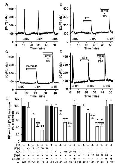 2.2. Kv7 Activators Reduce BK-evoked [Ca2+]i Responses in F11 Cells