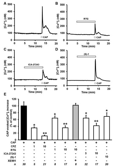 2.3. Kv7 Activators Reduce CAP-evoked [Ca2+]i Responses in F11 Cells