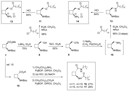 The synthetic route for the preparation of LMWG 16 and 17 (Scheme 3) starts with coupling of previously described trans-β-CBAA 15 [] with dodecyl- or hexadecylamine, using (benzotriazol-1-yloxy)tripyrrolidinophosphonium hexafluorophosphate (PyBOP) as a coupling agent in the presence of diisopropylethylamine (DIPEA) in dichloromethane, at room temperature, afforded the corresponding amides that, in separate processes, were submitted to amine deprotection by treatment with HCl followed of aqueous NaOH to provide the free amines. Further coupling with lauric or palmitic acid, under similar conditions as before, led to diamides 16 and 17, respectively, in 27–28% yield from 15. Preliminary experiments showed that these compounds are good gelators for alcohols (MeOH, EtOH, i-PrOH) with minimum gelation concentration (mgc) values 8–47 mg/mL and biocompatible EtOH–water mixtures (up to 30% water) with mgc = 10–16 mg/mL. These data differentiate these LMWG from alkyl bisamides prepared from cyclobutane-1,2-dicarboxylic acid, which were insoluble in alcohols [], and confer these products with very interesting features for future applications.