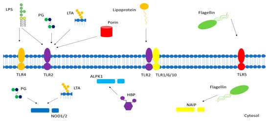 - Wolf, A.J.; Underhill, D.M. Peptidoglycan Recognition by the Innate Immune System. Nat. Rev. Immunol. 2018, 18, 243–254. [Google Scholar] [CrossRef]