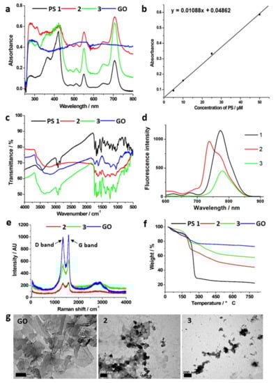 Characterisation of PS 1, and GO–PS complexes 2 and 3: (a) UV-VIS absorbance spectra of 1, 2, 3 and GO (dimethyl sulfoxide (DMSO)); (b) UV-VIS absorbance standard curve of 1 at 707 nm (DMSO), R2 = 0.99903; (c) FT-IR spectra of 1–3 and GO (KBr); (d) Fluorescence emission spectra of 1–3, excitation wavelength was 530 nm; (e) Raman spectra of 2, 3, and GO; (f) thermogravimetric analysis (TGA) graph of 2, 3, and GO; (g) transmission electron microscopy (TEM) images of GO, 2, and 3 (scale bar 100 nm for GO, and 200 nm for 2 and 3).