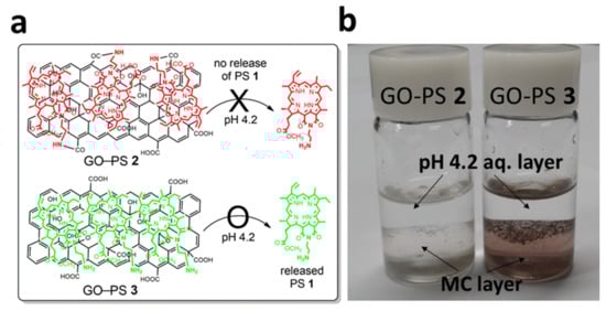 Importantly, the covalent bonding-assisted reaction of GO–PS complex 2 was carried out under a weak acidic condition (pH 4–6) to prevent noncovalent binding of the PS 1 on the GO nanosheet during the synthesis. However, GO–PS complex 3 was formed at neutral pH to maintain the noncovalently bound PS 1 on the GO nanosheet. Figure 2 shows the results of the release test of PS 1 from both GO–PS complexes 2 and 3 (solid samples in water and methylene chloride (MC) layers), in which PS 1 was easily released from GO–PS complex 3 (noncovalently bound) in the acidic condition (pH 4.2), which resulted in a pink colour of the MC layer (Figure 2b). This observation indicated that PS 1 was successfully noncovalently bound on the GO nanosheet in GO–PS complex 3. GO–PS complex 2 displayed no release of PS at the same pH because of covalent binding alone, which resulted in a colourless MC layer (Figure 2b), which clearly indicated that complex 2 contained only covalently-bound PS without noncovalently bound PS. In GO–PS complex 3, PS was released at 43% for 1 h, 58% for 3 h, and 63% for 24 h from the pH 4.2 aqueous layer containing acetone into the MC layer, in which delivery ability of 3 for 3 h corresponded with 92% of 24 h. This observation exhibited that 3 had a fast intracellular PS release effect. The pH-induced release of the noncovalently-bound PS (purpurin-18 methyl ester) from the GO surface has been described previously, where the acidic environment (pH 5.4) easily released noncovalently-bound PS from the GO surface [].