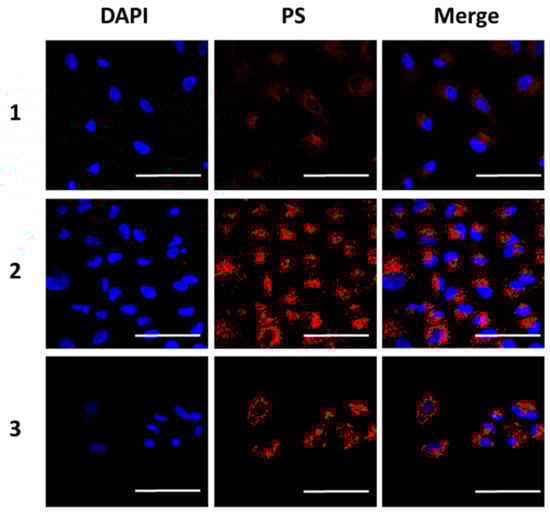 Uptake of 1, 2, and 3 by A549 cells before irradiation after 24 h incubation assessed using confocal laser scanning microscopy (CLSM). The concentration of PS was 1 μM in each sample. 4‘,6-Diamidino-2-phenylindole (DAPI) nuclear dye (blue), PS (chlorins, red) is shown in 1, 2 or 3 and in merged images. Bars, 100 μm.