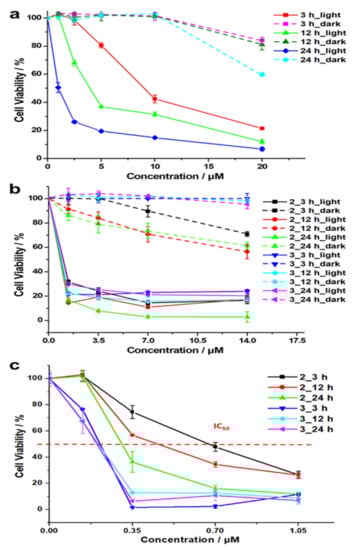 Cell viability against A549 cells for photocytotoxicity (light, total light dose 2 J·cm−2; irradiation time 15 min) and dark cytotoxicity (dark) after 3, 12, and 24 h incubation times of (a) 1 at concentrations of 1.0–20.0 μM, (b) 2 and 3 at concentrations of 1.4–14.0 μM, and (c) photocytotoxicity (total light dose 2 J·cm−2) of 2 and 3 at low concentrations of 0.14–1.05 μM. The percentage of cell viability was determined by an 3-(4,5-dimethylthiazol-2-yl)-2,5-diphenyltetrazolium bromide (MTT) assay. Error bars represent the standard deviation of three replicate experiments.