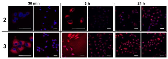 Time-dependent intracellular uptake of 2 and 3 by A549 cells without irradiation after 30 min, 3 h, and 24 h incubation assessed using CLSM. The concentration of PS was 2 μM in each sample. Merged images are shown with DAPI (cell nuclei, blue) and PS (chlorins, red) in 2 or 3. Bars, 50 μm.