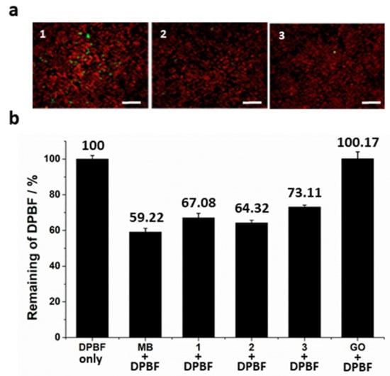 DPBF was used as a selective singlet oxygen (1O2) acceptor, being bleached upon reaction with 1O2. Seven sample solutions of DPBF in DMSO (50 μM) containing DPBF only (50 μM, control sample), DPBF + MB (1 μM), DPBF + PS 1 (1 μM), DPBF + GO–PS 2 (1 μM), DPBF + GO–PS 3 (1 μM), and DPBF + GO (1 μM) were prepared in the dark. All samples were put into wells of a 48-well plate and covered with aluminum foil. The plate was irradiated (2 J·cm−2) for 15 min. The absorbance of each sample was measured at 418 nm using a fluorescence multi-detection reader.