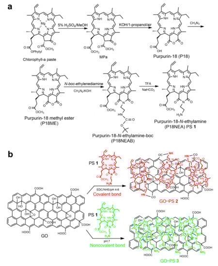 (a) Synthetic scheme of purpurin-18-N-ethylamine, photosensitizer (PS) 1. (b) Preparation of graphene oxide–photosensitizer (GO–PS) complexes via covalent (GO–PS 2) and non-covalent bonds (GO–PS 3).