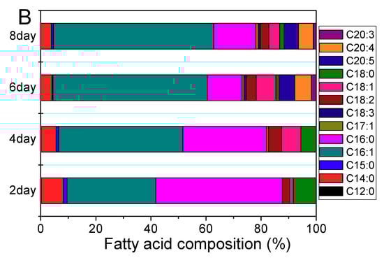 Lipid in the freeze-dried biomass was extracted with methanol-chloroform (2:1, v/v) and the lipid content was then calculated gravimetrically. The lipid contents at day two and day four were only 11.4% and 15.5%, respectively, but it reached a higher value of 26.7% and 28.7% at day six and day eight (Figure 1A). With the increase of the lipid, the carbohydrate content of the heterotrophic T. minus decreased from 66.7% at day two to 49.2% at day eight, whereas the protein content was relatively stable (around 12%). The lipid yield on the glucose of T. minus was estimated as 0.19 g g−1 (at day six) and the lipid productivity was calculated as 1.41 g L−1 d−1, 1.71 g L−1 d−1, and 1.05 g L−1 d−1, at day four, six, and eight, respectively, revealing that if this “one pot” cultivation method was used, the appropriate time to harvest T. minus is the sixth day, i.e., three days after the end of the exponential phase. Compared with the batch cultivation in our previous work [], the highest biomass was improved from 30.8 g L−1 to 42.9 g L−1 by a fed-batch cultivation in this research, and the lipid productivity was also enhanced by 2.5 folds.