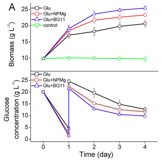 The T. minus biomass was re-inoculated into three different heterotrophic mediums including the Glu medium (adding glucose in water), Glu+NPMg medium (adding glucose, N, P, and Mg in water), and Glu+BG11 medium (adding glucose in a BG11 medium) and one control medium (pure water). As presented in Figure 2A, T. minus grew well in those tested mediums except in the pure water, and the more abundant the nutrients provided, the faster the growth was and the higher the biomass achieved. The final biomass of T. minus after four days of induction cultivation was 20.6, 23.3, and 25.4 g L−1 in the Glu medium, Glu+NPMg medium, and Glu+BG11 medium, respectively, and the residual glucose in each medium was 12.7, 11.7, and 9.9 g L−1, respectively. According to the consumption of glucose, the final biomass yields on glucose were 0.40 g g−1, 0.48 g g−1, and 0.53 g g−1 (p < 0.05) for the medium Glu, Glu+NPMg, and Glu+BG11, respectively.