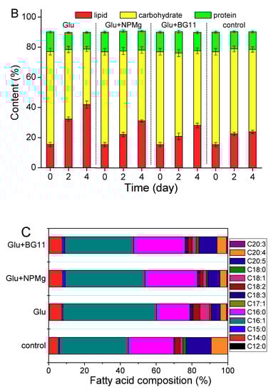 Conversely, the lipid content of T. minus in a different medium showed a great difference (Figure 2B). The lipid content of T. minus in a Glu medium fleetly increased from 15.5% at the beginning to 41.9% at day four, while other medium groups only performed a sluggish acceleration in the lipid accumulation, and the more comprehensive the nutrition was, the lower the lipid content increased. With the extension of the cultivation time, the carbohydrate content of T. minus decreased in all kinds of mediums, in which the Glu medium led to a greatest reduction from 61.6% at day 0 to 36.9% at day four. The final carbohydrate contents of T. minus in the Glu+NPMg medium and Glu+BG11 medium were 47.1% and 49.6%, respectively. A surprising result is that when T. minus was induced in pure water, although the biomass accumulation stopped, a sizable rise of the lipid content was observed. The lipid yield on the glucose of T. minus in the Glu medium was 0.26 g g−1, which was much higher than that in the Glu+NPMg medium (0.20 g g−1) and Glu+BG11 medium (0.19 g g−1) (p < 0.05). The lipid productivity was calculated as 1.77 g L−1 d−1, 1.44 g L−1 d−1, and 1.42 g L−1 d−1, in the Glu, Glu+NPMg, and Glu+BG11 medium, respectively, revealing that under the heterotrophic regime, the most appropriate induction medium to further reinforce the accumulation of lipid in T. minus cells was the solution only containing glucose.