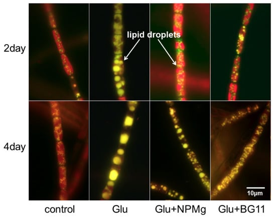 According to the results presented in Figure 2C, the highest proportion of the palmitoleic acid in the fatty acid profile was also observed in the Glu medium, calculated as 52.2%, which resulted in a highest palmitoleic acid productivity of 924 mg L−1 d−1. The microscopic images of lipid droplets in T. minus cells stained by Nile Red were shown in Figure 3. It clearly demonstrated that lipid droplets of T. minus in the Glu medium were heaviest and greatest in all groups.