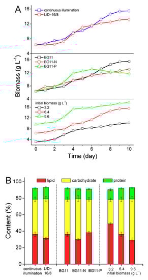 In this process, heterotrophic T. minus seeds were re-inoculated into a phototrophic medium, and three factors were investigated including illumination, nutrients, and initial inoculation density. As presented in Figure 4A, there was a lag phase (about two days) for all the tested groups when heterotrophic T. minus seeds were re-inoculated into the phototrophic medium. Compared with the light/dark = 16h/8h (L/D = 16/8) group, continuous illumination was more appropriate for the recovering of the photosynthetic system in T. minus cells, and a higher biomass concentration (15.5 g L−1) was obtained. Both the N and P starvation resulted in a low final biomass density, even though the growth rate was motivated by the P starvation for a short time after the lag phase. In the initial inoculation biomass test, the highest final biomass of 17.7 g L−1 was reached when the inoculation density was 9.6 g L−1. However, in consideration of the biomass productivity, the optimal initial density was 6.4 g L−1, which led to a highest biomass productivity of 0.9 g L−1 d−1 under phototrophic conditions.