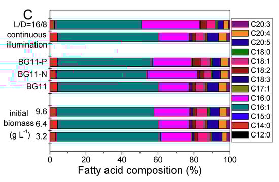 The lipid accumulation of T. minus re-cultivated phototrophically was significantly influenced by the induction conditions as plotted in Figure 4B (p < 0.05). The final lipid content under continuous illumination reached up to 36.2% from 15.5% at the beginning of the process, in comparison with 31.4% under a L/D = 16/8 illumination, indicating that reducing the illumination time weakened not only the biomass but also the lipid accumulation. In contrast with full strength of the BG11 medium, the absence of nitrogen in the medium was less advantageous for reinforcing the lipid accumulation of T. minus, which was consistent with the conclusion released by Guo et al. [] under a phototrophic condition. Nitrogen starvation is generally identified as an effective regulation method for the lipid accumulation to various microalgae strains under phototrophy [,,], but for T. minus, according to our present results, its inductive effect is relatively weak. This specific regulatory mechanism is still unclear, and further researches on the transcriptomics and metabolomics analysis under different N levels may lead to a clearer understanding. There was just a slight lipid promotion in the phosphorus deficient group, probably due to the longer stationary phase (in comparison with the BG11 group), in which lipid is the major product of biosynthesis in the T. minus cells. Among the three inoculation densities, the highest lipid content of 49.0% and lowest carbohydrate content of 29.1% were obtained simultaneously when the initial inoculation density was 3.2 g L−1, and the lipid content decreased when the initial inoculation density was enhanced. The lipid productivity was calculated as 0.45 g L−1 d−1, 0.45 g L−1 d−1, and 0.36 g L−1 d−1 with the three initial inoculation densities, respectively. This result agrees with our previous work [], and the possible reason is that for the phototrophic microalgae, light is the sole energy to drive the fixation of CO2 and biosynthesis of biomolecules and more photons could be absorbed by algal cells under an appropriately diluted biomass density. By comparing the palmitoleic acid proportion in the fatty acid profiles under a heterotrophic induction (Figure 2C) and phototrophic induction (Figure 4C), a higher palmitoleic acid content was obtained under the latter one, while of which, reducing the illumination time, depriving of N or P in the medium, or inoculating excessive high initial biomass would result in the decrease of the palmitoleic acid proportion.