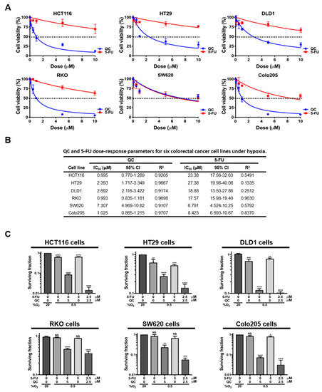 2.1. QC Sensitizes CRC Cells to 5-FU in Hypoxia