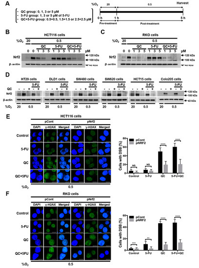QC sensitizes CRC cells to 5-FU in hypoxia by inhibiting nuclear factor (erythroid-derived 2)-like 2 (Nrf2). (A) Scheme of the treatment and sampling procedure. (B,C) Effect of the QC/5-FU combination on Nrf2 expression in HCT116 (B) and RKO (C) cells under hypoxic conditions. (D) Effect of the QC/5-FU combination on Nrf2 expression in HT-29, DLD1, SW480, SW620, HCT15, and Colo205 cells under hypoxic conditions. Representative images of Nrf2 and β-actin were detected by immunoblot. Representative images of immunoblots for each protein were obtained using the same sample on different gels after a single experiment. (E,F) Effect of Nrf2 overexpression on DNA damage induced in HCT116 (E) and RKO (F) cells by the QC/5-FU combination under hypoxic conditions. γ-H2AX (green) staining in HCT116 (E) and RKO (F) cells following treatment (left), and the relative percentage of foci-positive cells (right). Data are presented as means ± SD (** p < 0.01, *** p < 0.001, **** p < 0.0001 by ANOVA). “NS” indicates not significant (p > 0.05).