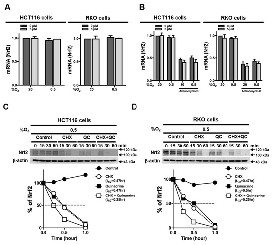 To determine how QC inhibits Nrf2 expression in CRC cells, we first measured expression levels of Nrf2 mRNA in the absence or presence of QC in normoxia and hypoxia. We found that QC did not alter Nrf2 mRNA expression in CRC cells, regardless of O2 tension (Figure 3A). To determine whether QC affects the mRNA stability of Nrf2 in CRC cells, we treated HCT116 and RKO cells with 5 μM QC under normoxia or hypoxia for 4 h in the presence of 5 μg/mL actinomycin D, which blocks de novo mRNA synthesis. QC did not alter Nrf2 mRNA expression in either of these cell lines under normoxia or hypoxia (Figure 3B), suggesting that QC does not regulate the transcription or degradation of Nrf2 mRNA. To test whether QC affects the accumulation and stability of Nrf2 protein, we incubated HCT116 and RKO cells in hypoxia for 1 h with QC in the presence of the protein synthesis inhibitor cycloheximide (CHX) and monitored decreases in Nrf2 protein levels over time in its absence by immunoblotting. Under hypoxic conditions in the presence of 10 μg/mL CHX, 5 μM QC decreased the half-life of Nrf2 from 0.47 to 0.25 h (Figure 3C,D), suggesting that QC decreases Nrf2 expression by decreasing the stability of the Nrf2 protein.