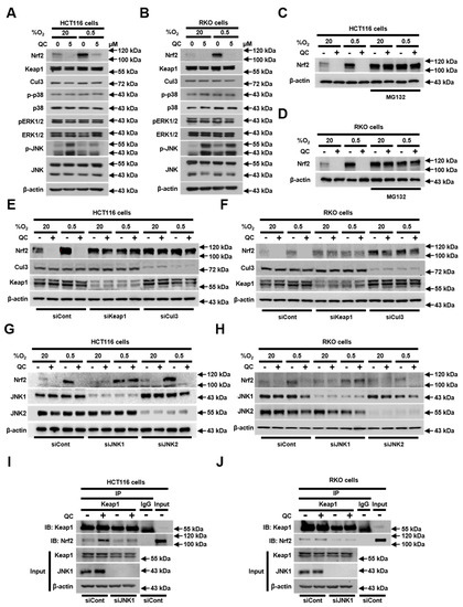 JNK1 activation is required for the QC-induced degradation of Nrf2 protein. (A,B) Effect of QC on the expression of Nrf2, Keap1, Cul3, p-p38, p38, pERK1/2 (phospho extracellular signal-regulated kinases), ERK1/2, p-JNK, JNK, and β-actin in HCT116 cells (A) and RKO cells (B) under normoxic and hypoxic conditions. (C,D) Effect of QC on the proteasome-mediated degradation of Nrf2 in HCT116 cells (C) and RKO cells (D) under normoxic and hypoxic conditions. (E,F) Effect of QC on Keap1/Cul3-dependent degradation of Nrf2 in HCT116 cells (E) and RKO cells (F) under normoxic and hypoxic conditions. (G,H) Effect of JNK1 activation on QC-induced inhibition of Nrf2 in HCT116 cells (G) and RKO cells (H) under normoxic and hypoxic conditions. (I,J) Effect of QC on the interaction between Nrf2 and Keap1 in HCT116 cells (I) and RKO cells (J) under hypoxic conditions. Representative images of Nrf2, Keap1, Cul3, p-p38, p38, pERK1/2, ERK1/2, pJNK, JNK, and β-actin were detected by immunoblot. Representative images of immunoblots for each protein were obtained using the same sample on different gels after a single experiment.