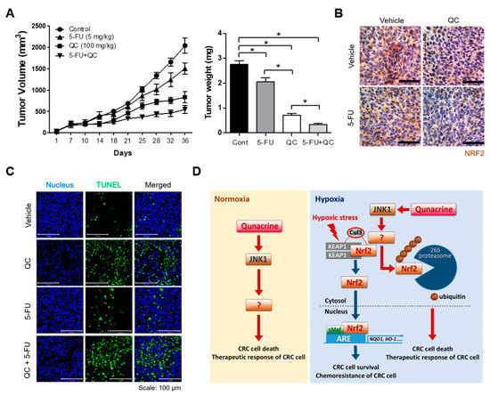 The QC/5-FU combination inhibits tumor growth in a tumor xenograft mouse model. (A) Tumor volume was measured at the indicated times (left panel), and tumor weight was quantified at the end of the experiment (right panel). Data are presented as means ± SEM (n = 7 mice/group; * p < 0.05). (B) Representative images of immunohistochemical analyses of Nrf2 in tumors derived from HCT116 xenografts. Scale bar = 50 μm. (C) Apoptotic cells were detected in HCT116 xenograft tumors using a TUNEL (terminal deoxynucleotidyl transferase dUTP nick end labeling) assay kit. Scale bar = 100 μm. Blue, nuclei; green, TUNEL staining. (D) Schematic model showing how QC reverses hypoxia-induced 5-FU resistance in CRC cells under normoxia and hypoxia by inhibiting Nrf2.