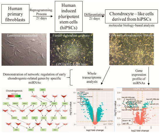 Scheme of experiment. The primary human dermal fibroblasts (image: 20× magnification) from a breast cancer patient were obtained to generate human induced pluripotent stem cells (hiPSCs: GPCCi001-A cell line) (image: 10× magnification) by the use of lentiviral transfection [15]. Then, hiPSCs underwent chondrogenic differentiation via monolayer culture with the addition of growth factors for 21 days. The obtained chondrocyte-like cells (image: 10x magnification) demonstrate the presence of markers specific for human chondrocytes (inter alia: The presence of type II collagen) [6]. To take a closer look at obtained chondrocyte-like cells derived from hiPSCs, their gene expression profile was investigated. It was revealed that these cells activate signaling pathways characteristic of cells from early stages of chondrogenesis [7,9,16]. In this study, we aimed to investigate the relationship between microRNAs (miRNAs) and most highly expressed early chondrogenic genes regulated by them. Interestingly, we indicated several new miRNAs engaged in chondrogenesis of hiPSCs.