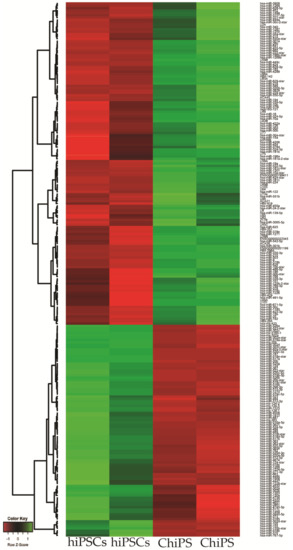 Heatmap graphs of the miRNAs in the experimental groups: chondrocytes derived from hiPSCs (ChiPS) vs. hiPSC. Arbitrary signal intensity acquired from the microarray analysis is represented by the colors (green = higher expression; red = lower expression). Log2 signal intensity values for any single gene were resized to row Z-score scales.