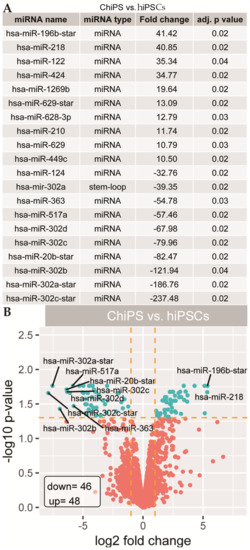 The table shows 20 miRNAs with the highest (10 miRNAs) and lowest (10 miRNAs) fold changes from the lists of differentially expressed miRNAs between ChiPS and hiPSCs (A). The volcano plot shows the total miRNAs expression profiles of the ChiPS and hiPSC experimental groups. Each dot represents the mean expression level of a single miRNA obtained from a microarray normalized dataset. The orange dotted lines (cut-off values) were established according to the following parameters: |fold| > 2 and adjusted (adj.) p-value < 0.05. miRNAs above the cut-off are considered to be differentially expressed and are shown as blue dots. The total number of differentially expressed miRNAs are displayed in the bottom left corner of the graph (B).