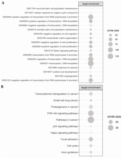 miRNA targets were assigned to Gene Ontology—Biological Process (GO.BP) (A) and Kyoto Encyclopedia Genes and Genomes (KEGG) databases (B). The size of grey circles represents the number of target genes regulating the described signaling pathways. The intensity of grey color symbolizes the statistical significance (the darker the shade of green, the lower adj. p-value).