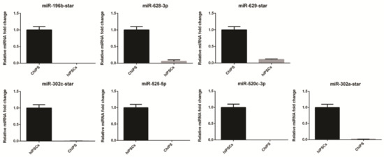 The most up- and downregulated miRNAs were verified by the RT-qPCR technique: hsa-miR-196b-star, hsa-miR-628-3p hsa-miR-629-star, hsa-miR-302c-star, hsa-miR-525-5p, hsa-miR-520c-3p, and hsa-miR-302a-star (Figure 6).