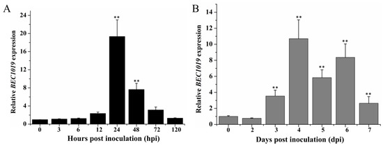 To investigate whether Bgt and Ggt employ the effector gene BEC1019 to facilitate host plant colonization and interfere with the different layers of wheat defenses induced during infection, we performed qRT-PCR to assess BEC1019 expression in Bgt-infected wheat leaves at different time points (0, 3, 6 12, 24, 48, 72, and 120 hpi) and in Ggt-infected wheat roots at different stages (0, 2, 3, 4, 5, 6, and 7 dpi). With regards to Bgt, the aforementioned time points represent the following stages of infection: non-germinated conidia (0 hpi), primary germ tube formation (3 hpi), appressorial germ tube formation (6 hpi), penetration (12 hpi), haustorium formation (24 hpi), secondary penetration (48 hpi), microcolony formation (72 hpi), and conidiophore formation (120 hpi) [29,35]. Using the elongation factor 1α (ef-1α) gene of Bgt as an internal reference gene, we found that the transcript level of BEC1019 was weakly induced during the first four stages of infection (0–12 hpi), whereas during haustorium formation (24 hpi), the abundance of BEC1019 increased by 19-fold compared with that at 0 hpi. Thereafter, BEC1019 expression gradually decreased with increasing Bgt colonization time, and at 120 hpi the BEC1019 transcript level had declined to pre-inoculation levels (Figure 2A).