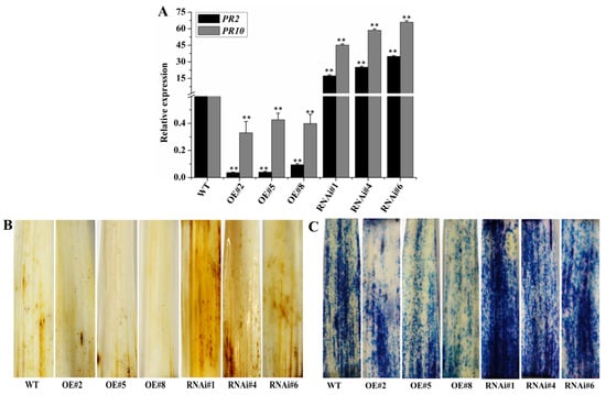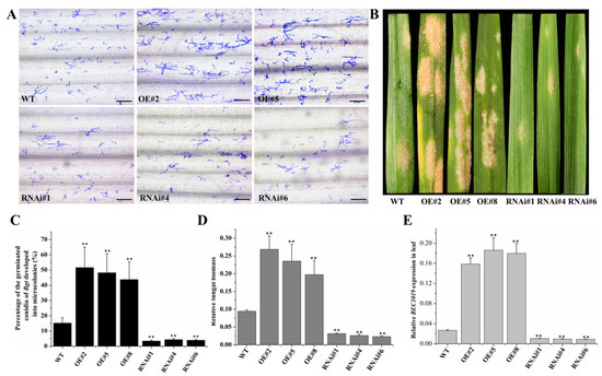 Overexpressing and RNAi transgenic Aikang 58 wheat leaves were inoculated with Bgt and the subsequently infected leaves were microscopically analyzed using previously described procedures [24], with minor modifications. Leaf segments were collected from three 1-week-old transgenic wheat lines and placed on a 1% agar plate containing 85 µM benzimidazole. These were incubated in a 20 °C climate chamber for more than 4 h and then inoculated with Bgt spores by gently spreading fresh conidia on the leaves at an appropriate density (~250 conidiospores per·cm2 of leaf). Bgt was allowed to develop on the leaves for 60 h, and then the leaf segments were fixed in ethanol/acetic acid (1:1, v/v), stained with Coomassie brilliant blue R250 in methanol (0.6%, w/v) for 10 s, rinsed in deionized water, and observed and enumerated under a BX61 upright microscope (Olympus, Tokyo, Japan). More than 1000 germinated spores on each leaf segment from each plant were observed. The phenotypes of the inoculated transgenic leaves were observed and photographed using a Canon EOS 600D camera (Canon Corp., Tokyo, Japan) at 7 dpi.