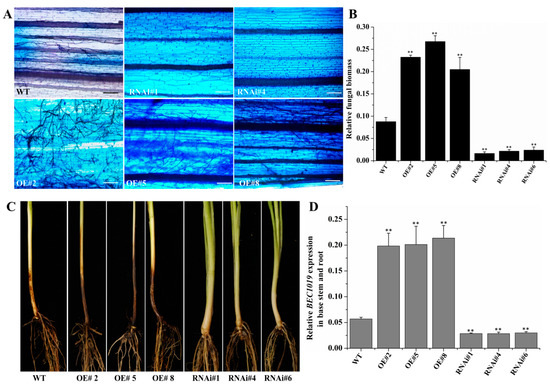 Overexpression of BEC1019 in Zhoumai 26 wheat increased susceptibility to the necrotrophic pathogen Gaeumannomyces graminis var. tritici (Ggt), whereas silencing BEC1019 decreased susceptibility to Ggt. (A) Macroscopic responses to Ggt infection on the stems and roots of BEC1019-overexpressing and RNAi lines and wild-type control plants. (B) Relative Ggt biomass of control wheat and BEC1019 overexpressing and RNAi plants. (C) Microscopic analysis showing the growth of Ggt hyphae on the stems of wild-type plants and BEC1019-overexpressing and RNAi plants after inoculation. Scale bar = 25 µm. (D) Transcript levels of BEC1019 in Ggt-infected base stems and roots of overexpressing and RNAi transgenic plants. Double asterisks indicate significant differences relative to the control plants (p ≤ 0.01, according to t-tests).