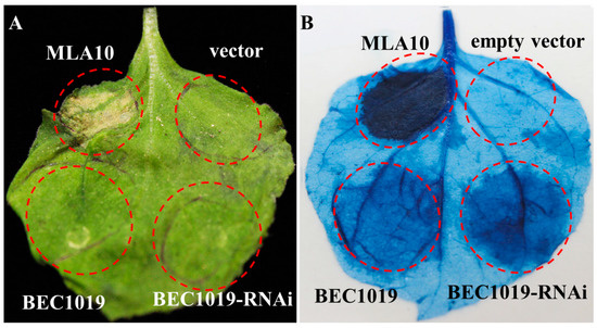 Analysis of cell death triggered by BEC1019 in Nicotiana benthamiana. The barley resistance gene MLA10 (positive control) and full-length and RNAi partial sequences of BEC1019 were expressed via agro-infiltration in N. benthamiana (A), and cell death representing HR was visualized by trypan blue staining (B) at 5 days post-agro-infiltration. No HR induction was detected in the negative control (empty vector).