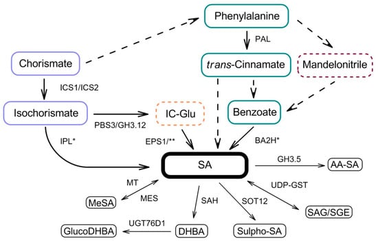 SA biosynthesis pathways in plants. Solid arrows represent single enzymatic steps. Dashed arrows represent multiple consecutive enzymatic steps. AA-SA, amino acid-SA conjugate; BA2H, benzoic acid 2-hydroxylase; DHBA, dihydroxybenzoic acid; EPS1, Enhanced Pseudomonas Susceptibility 1; GH3.5, Gretchen Hagen 3.5; ICS, isochorismate synthase; IC-Glu, isochorismate-9-glutamate; IPL, isochorismate pyruvate lyase; MeSA, methyl-salicylate; MES, methyl-salicylate esterase; MT, metyl transferase; PAL, phenylalanine ammonia-lyase; PBS3, avrPphB susceptible 3; SAG, salicylic acid glucoside; SAH, salicylic acid hydroxylase; SGE, salicylic acid glucose ester; SOT12, sulfotransferase 12; UDP-GST, UDP-glycosyltransferase; UGT76D1, UDP-glycosyltransferase 76D1; *, enzyme not cloned in plants; **, non-enzymatic decay.