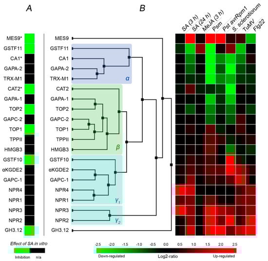 In panel B (Figure 2), we show two sets of transcriptomics data. A first set was used to draw the dendrogram showing the hierarchical clustering of SABPs based on their expression across 111 conditions. In these experiments, A. thaliana plants were challenged with bacterial (Pseudomonas spp.), fungal (Sclerotinia sclerotiorum, Golovinomyces orontii, Hyaloperonospora arabidopsidis) and viral (TuMV) pathogens. All of these conditions should directly implicate SA signaling responses. We could separate three clusters. The alpha cluster represents the genes whose expression was mostly inhibited by the treatments; the gamma clusters represent genes whose expression was induced by the treatments while the beta cluster represents genes exhibiting an intermediate situation.