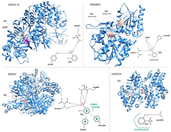 In conclusion, SA binds to proteins both in plants and animals using similar mechanisms. As a common rule, binding occurs by hydrogen bond formation between the carboxyl group of SA and side chains of various amino acid residues (Arg, Tyr, Ala, Ser, His). Such interaction could be strengthened by nonpolar/π-π contacts made by the aromatic ring of SA. The side hydroxyl group of SA can also be involved. The change in its relative position is enough to alter the binding affinity of SA/4-HBA to proteins [81,89].