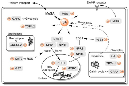 At least two enzymes directly involved in energy metabolism have been found to bind SA—GAPDH (glycolysis) and alpha-ketoglutarate dehydrogenase (Krebs cycle). This could be a way for SA to control the stress-to-growth transition of cell metabolism. Alternatively, since cytosolic GAPDH has been shown to be a dual activity enzyme [87], SA could be a trigger for the transition.
