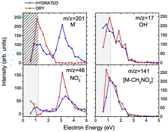 Ion yields for the formation of selected anions from misonidazole as a function of the energy of the incident electron. Red and blue curves show a molecular beam of MISO without and with hydration, respectively (“dry” and “hydrated”). The region of a strong decrease in the electron current is hatched.