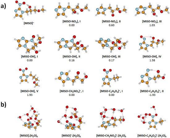The anions can be therefore formed by direct electron attachment to the impurity of the sample (0.5% mol) or as a thermal decomposition product of MISO or by DEA to MISO. In all cases, the most probable structure is the 1-ethyl-2-nitroimidazole anion ([MISO-CHO], I depicted in Figure 3).
