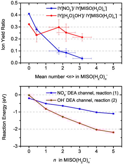 Evolution of relative ion yields for OH and NO fragments as a function of hydration (top) and computed reaction energies for respective DEA reaction channels (bottom).