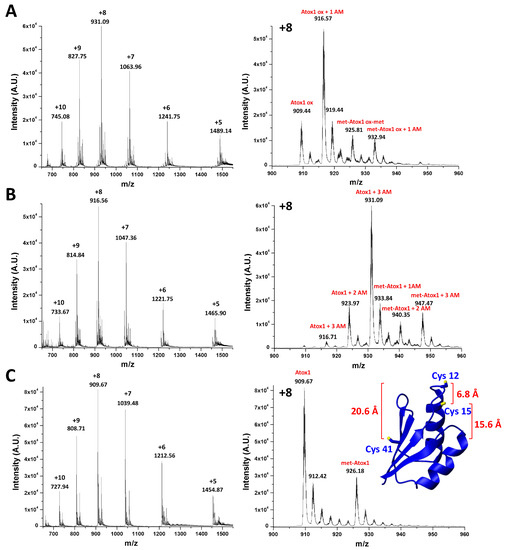The complete oxidation of Atox1 was conducted by incubating the protein with three equivalents of GSSG for 12 h at 25 °C. Optimal reaction conditions for quantitative oxidation were chosen after several tests in order to avoid harsh treatments. To monitor the oxidation status of Atox1, electrospray mass spectrometry (ESI-MS) experiments were performed. Since the oxidized and reduced forms differ by only 2 Da, the analysis was carried out by incubating the protein in the dark for 30 min with 50 equivalents of 2-iodoacetamide (IAM) in 20 mM ammonium acetate (pH 6.3). IAM is a commonly used alkylating agent for free thiols in proteins [30]. Alkylation by IAM of reduced cysteines results in the covalent coupling of a carbamidomethyl (AM) group (57.1 Da). The ESI-MS spectra of reduced and oxidized Atox1 treated with IAM (Figure 1A,B), compared to those of the reduced, untreated protein (Figure 1C), show that the most abundant species in the first case corresponds to Atox1 + 3 AM and in the second case to Atox1 + 1 AM. This result indicates that two cysteines of oxidized Atox1 are involved in a disulfide bond, hence they are not subject to IAM modification. The average interatomic distances between sulfur atoms of Cys residues in apoAtox1 (mean values resulting from a family of thirty NMR structures, PDB ID 1tl5 [17], of 6.8 ± 1.0 Å, 20.6 ± 0.8 Å, and 15.6 ± 1.4 Å for Cys12–Cys15, Cys12–Cys41, and Cys15–Cys41, respectively) indicate that an intramolecular disulfide bond can be formed between Cys12 and Cys15 of the CxxC motif, while Cys41 can still be modified by IAM (Figure 1A).