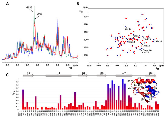 It can be hypothesized that the reduction takes place at the expense of GSH, in analogy with what has been observed in the case of Cu(I) [29]. Indeed, monitoring the reaction between 15N-labeled cisplatin and oxidized Atox1 in the absence of GSH/GSSG (removed from the reaction solution with Amicon filters having a cutoff of 3 kDa), even after 12 h of incubation no signals of Atox1-Pt adducts were observed (Figure 6B). If, however, GSH is added at the end of the incubation period, the platinum adduct with Atox1 starts to form, confirming the essential role of GSH.
